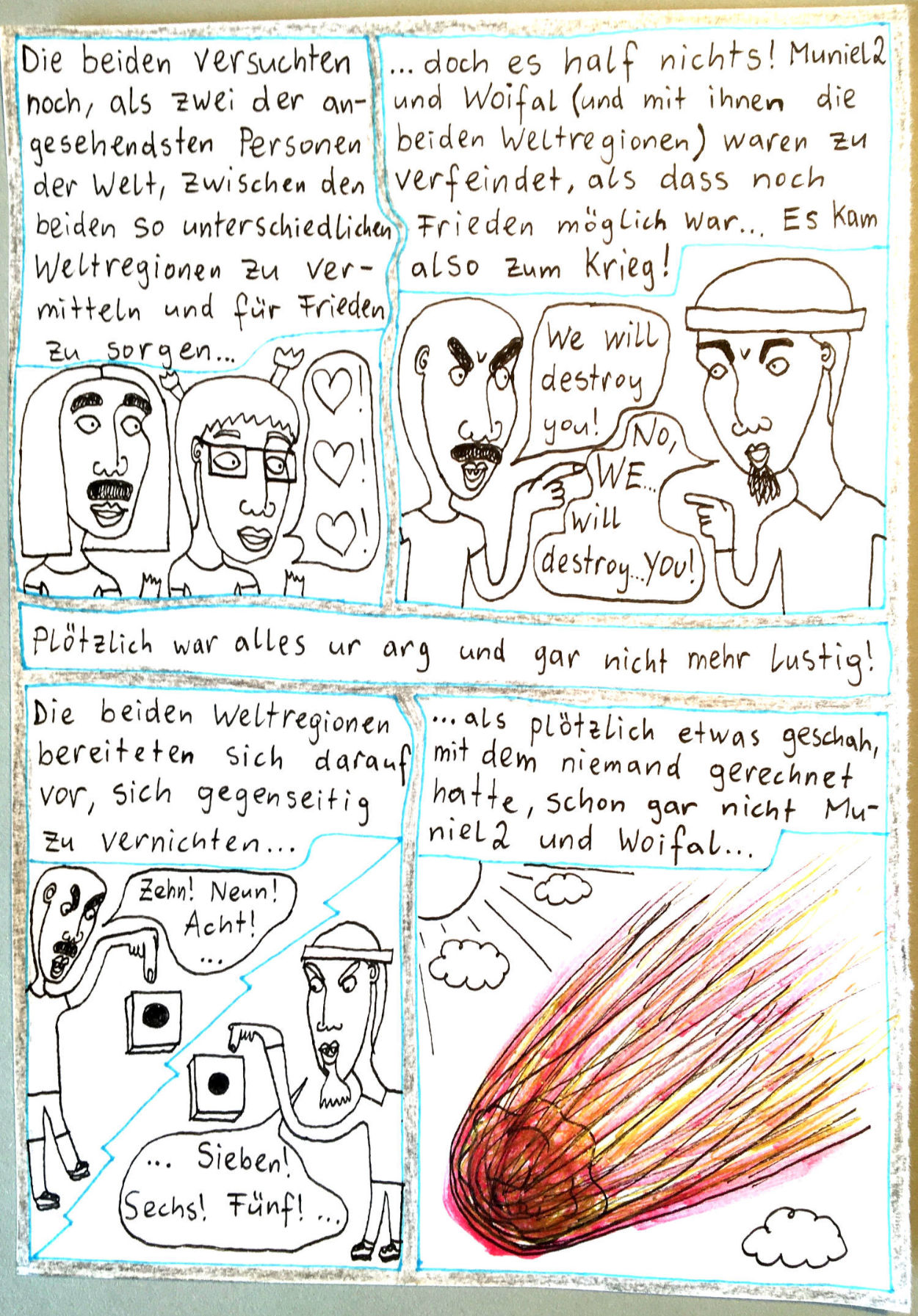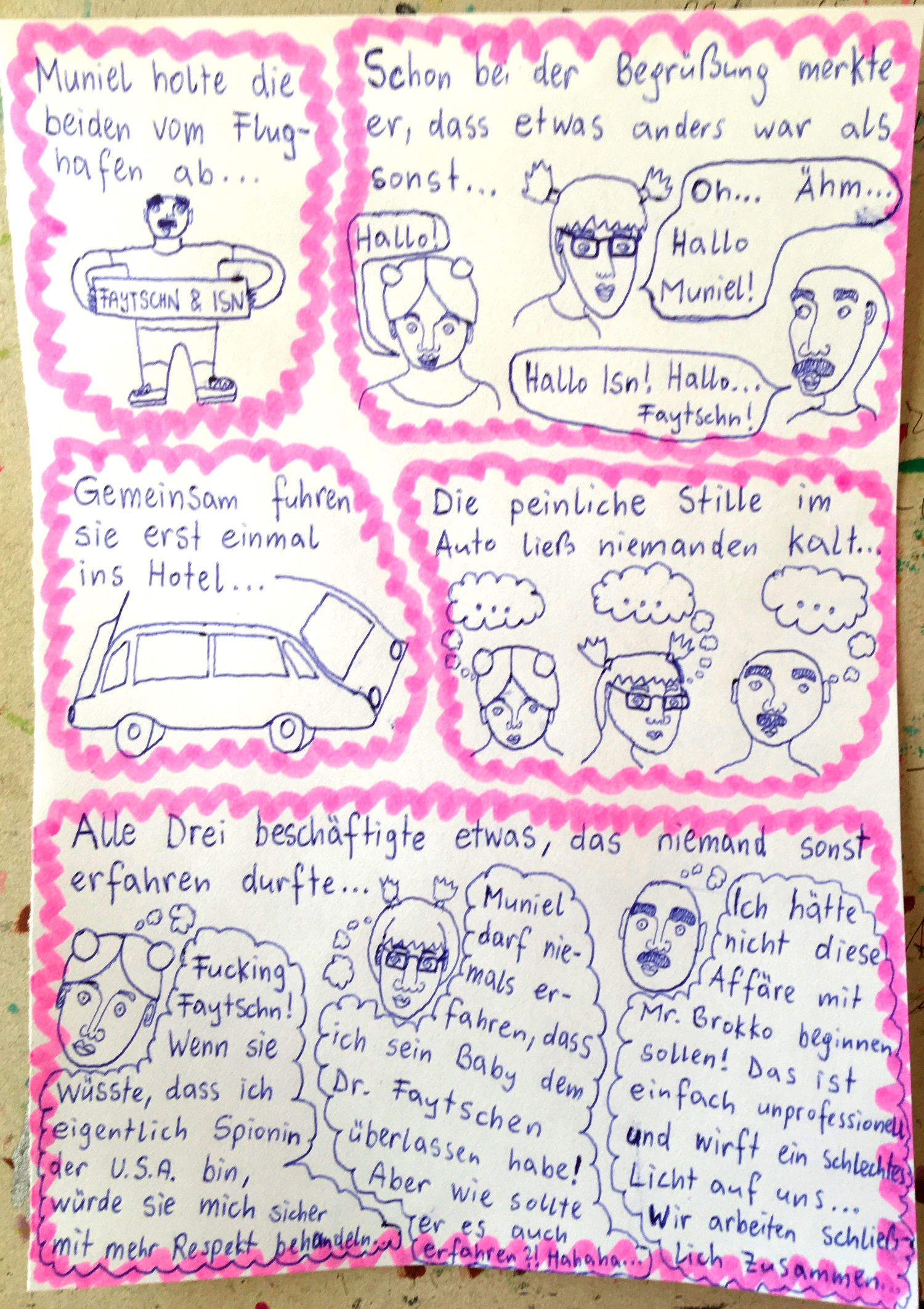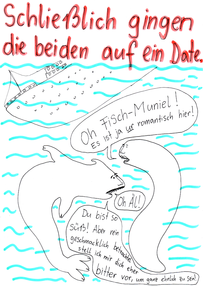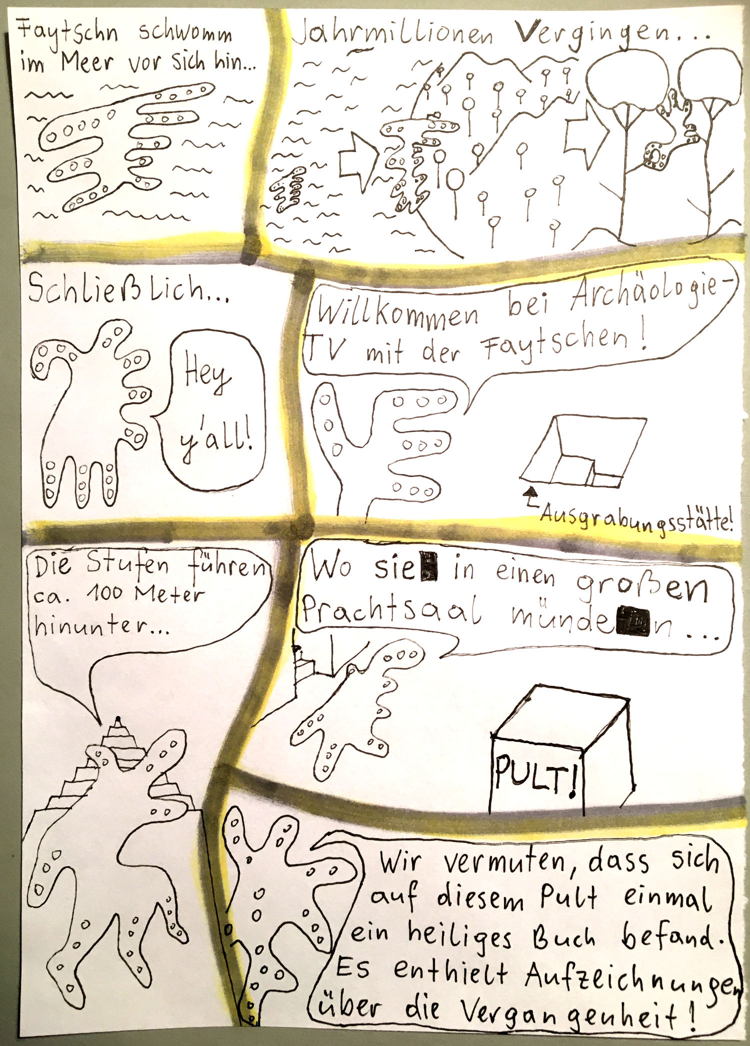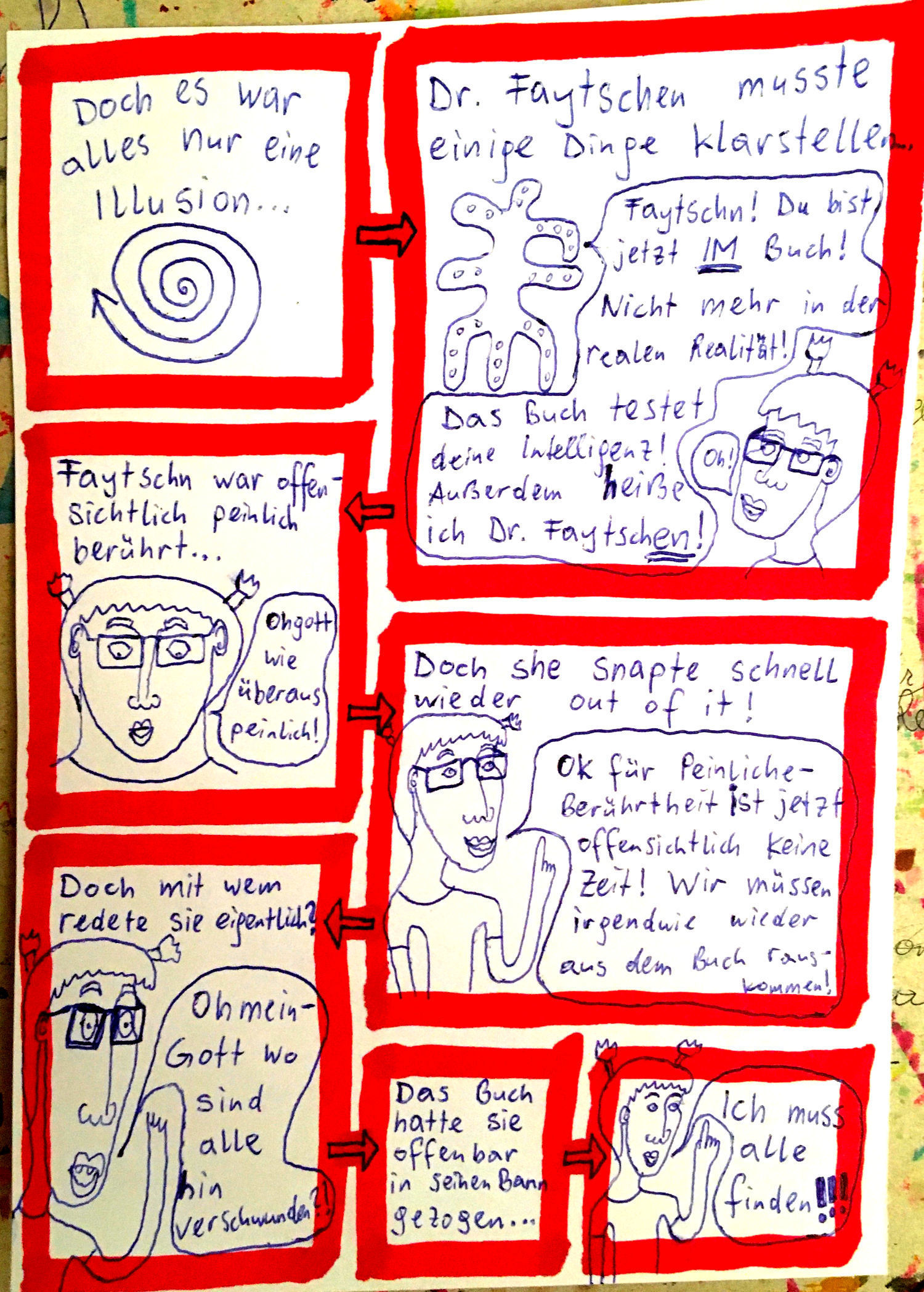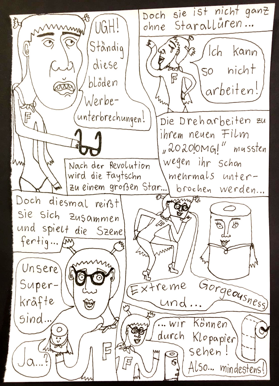 „Faytschn“ und ich hatten die Idee: Wir zeichnen abwechselnd Comicseiten, fotografieren sie und teilen sie in einer WhatsApp-Gruppe.