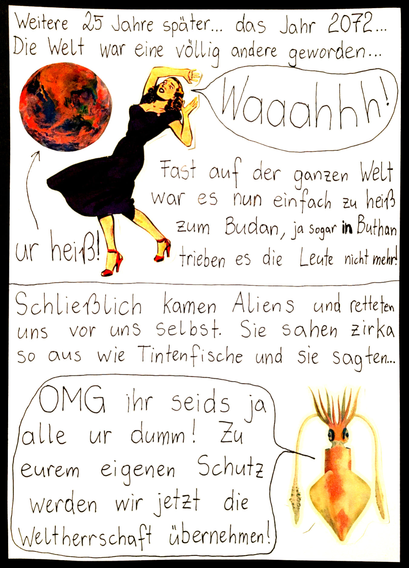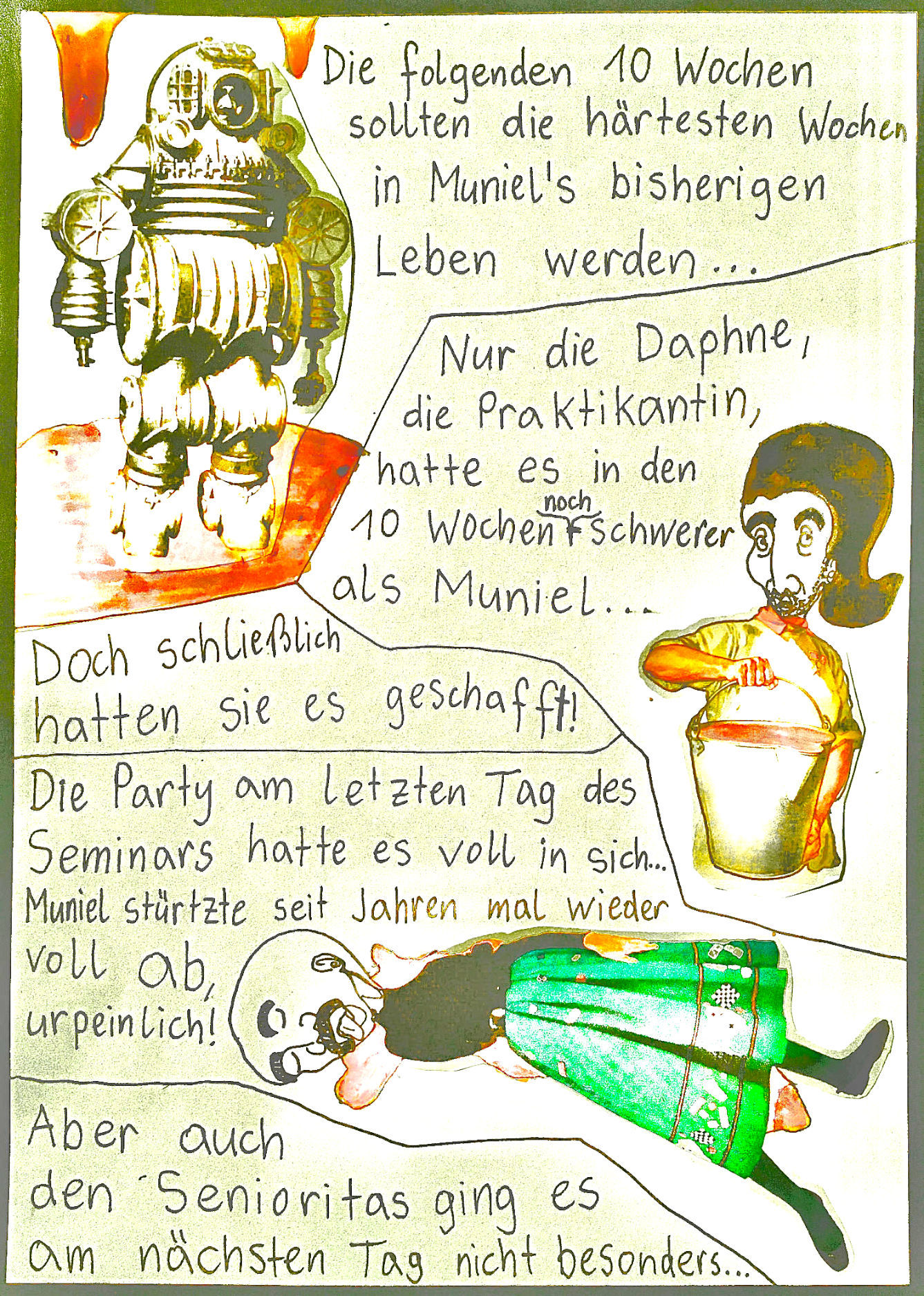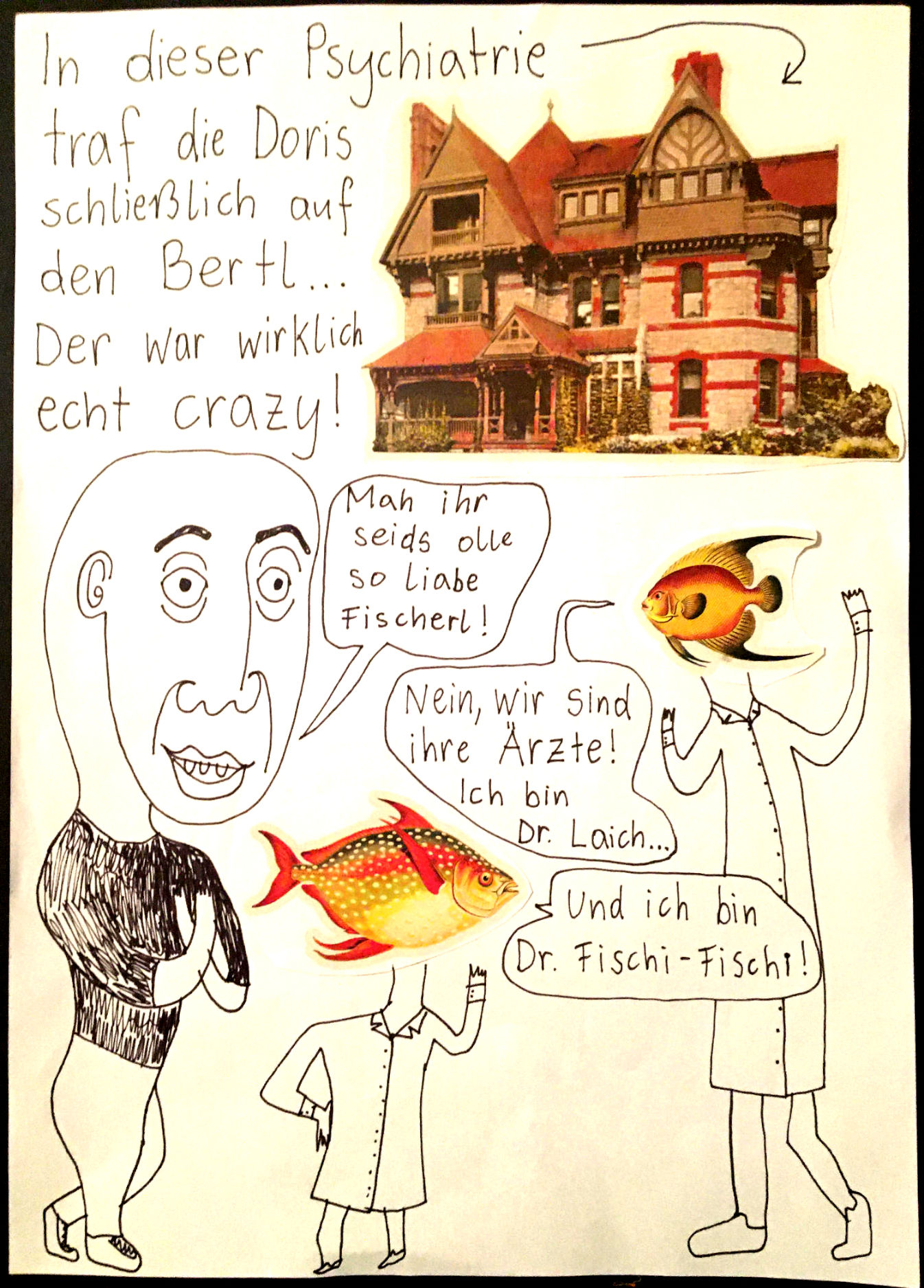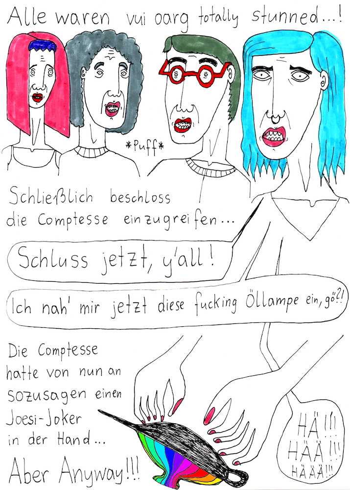 Los ging’s beim Collagen-Workshop von „Faytschn“ in der Buchhandlung Grohmann in Zwettl im August 2021, woraus dann diese absurd-coolen Collagen-Comics entstanden sind!